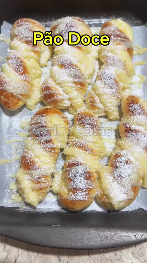 Pão Doce Creme Meia caixa de leite condensado 2 xícaras de leite 1 colher e meia de amido 2 gemas Modo de fazer Disolva amido no leite depois coloque tudo na panela e leve ao fogo e mexa até virar um creme reserve Massa 2 ovos 10 gr de fermento 240 ml de leite Pitada de sal 4 colheres de açúcar 600 gr de farinha Modo de fazer Bata no liquidificador quase todos os ingredientes menos a farinha Depois de batido coloca na bacia e vai colocando a farinha e vai sovando