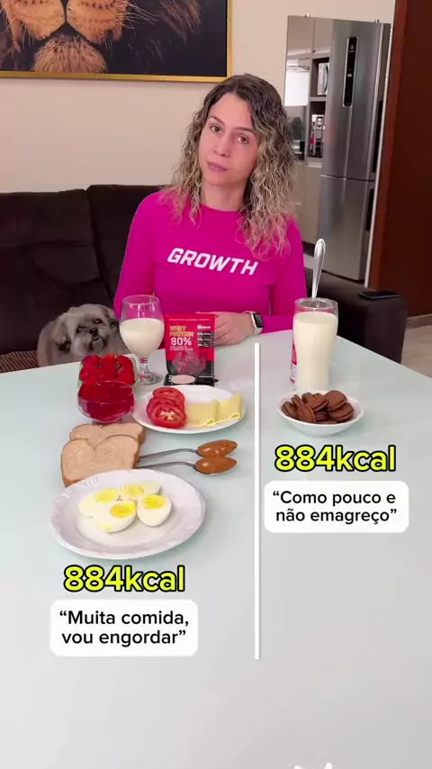 Você viu isso?👇😮 ➡️ “Como pouco e não emagreço” 1 copo de leite integral 2 colheres de Nescau 126g de bolacha recheada ➡️ “Muita comida, vou engordar” 2 fatias de pão 2 ovos 2 fatias de queijo 2 colheres de doce de leite 200ml de leite desnatado 30g de whey Growth (o melhor) 250g de morangos 1 tomate 1 bacia de gelatina zero ✅ Ou seja, a bonita ou o bonito poderia ter comido tudo isso com as MESMAS calorias daquele biscoito “inocente” com Nescau. Porque será que não emagrece hein?