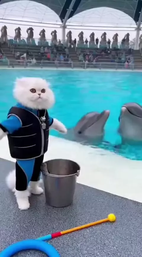 A white cat works as a dolphin trainer. #whitecat #funnycat #dolphintrainer