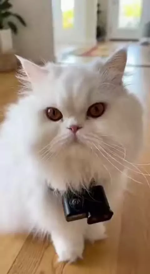 A white Persian cat is in front of the camera, with a collar around its neck. #whitecat #shortsvideo #funnycat