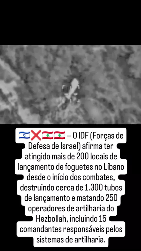 🇮🇱❌🇱🇧 Desde o início dos combates, as Forças de Defesa de Israel (IDF) afirmam ter atingido mais de 200 locais de lançamento de foguetes no Líbano, destruindo aproximadamente 1.300 tubos de lançamento e eliminando 250 operadores de artilharia do Hezbollah, incluindo 15 comandantes responsáveis pelos sistemas de artilharia. O impacto desta operação reforça a intensidade do conflito e destaca o esforço de Israel em neutralizar ameaças estratégicas. #ConflitoNoOriente #Hezbollah #IDF #Líbano