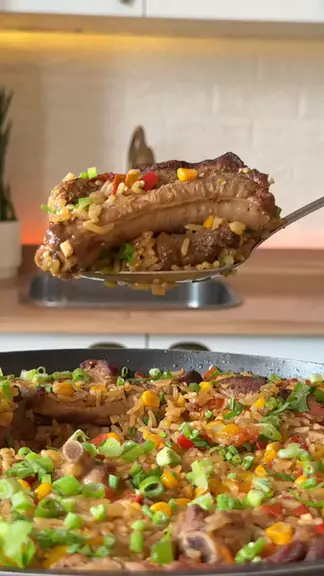 Arroz de costelinha 😲🔥 Essa receita de arroz com costelinha suína fica MARAVILHOSA! 😲😍 Ingredientes: 👇🏽 Utilizei 1,2kg de costelinha 4 dentes de alho 1 cebola 1 pimentão amarelo 1 pimentão vermelho 1 tomate 1 lata de milho verde 2 xícaras de arroz parboilizado Sal, pimenta do reino, chimichurri e páprica Salsinha e cebolinha para finalizar