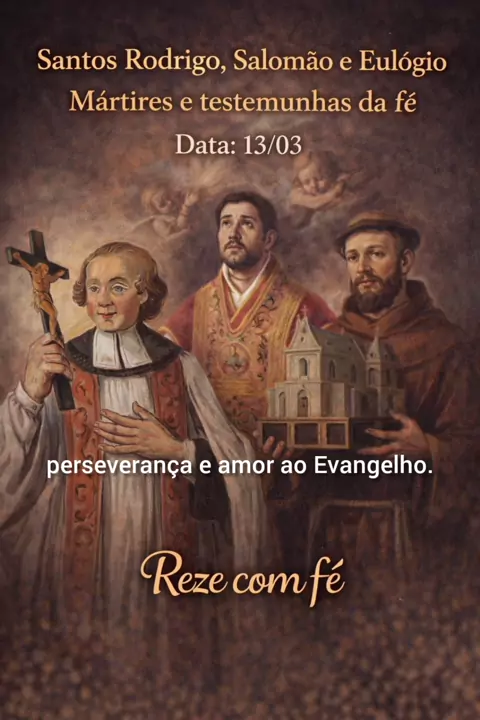 Os santos Rodrigo, Solomão e Eulogio deram testemunho de coragem e fidelidade a Cristo mesmo diante da perseguição. Que o exemplo desses mártires fortaleça nossa fé e nos ensine a permanecer firmes no caminho de Deus. 🙏 💬 Comente: “Santos Rodrigo, Salomão e Eulógio, rogai por nós!” 📲 Compartilhe este vídeo para levar fé a mais pessoas. #santododia #rezecomfé #fécatólica #oração #santos