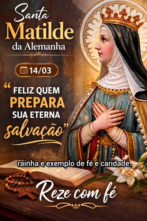 Hoje celebramos Matilda of Ringelheim, exemplo de fé, caridade e confiança em Deus. Mesmo sendo rainha, viveu com humildade e dedicou sua vida à oração e ao cuidado dos pobres. Que seu ensinamento nos lembre: “Feliz quem prepara sua eterna salvação.” 🙏✨ 💬 Comente: “Santa Matilde, rogai por nós!” 📲 Compartilhe este vídeo para que mais pessoas rezem conosco. #santamatilde #santododia #rezecomfé #fécatólica #catolicos