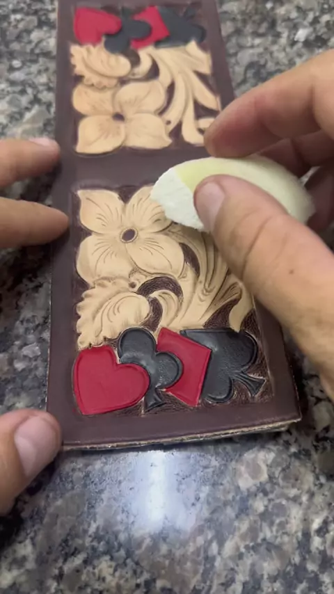 Pintura feita com Tinta Rápida Pinhão WV Custom para a base 🎨, sombreamento com Antique Gel Pinhão 🟤 e finalização com Brilho Sela para fixar e dar aquele toque de brilho ✨. Os naipes do baralho ganharam vida com Coucolor Preta e Vermelha ♠♥, trazendo contraste e personalidade à peça. Tudo aplicado em uma carteira pré-montada com bordado manual feita com carinho e técnica 🖐️. Todos os produtos são da WV Custom – pensados pra facilitar sua arte e deixar o resultado final impecável! #ArteEmC