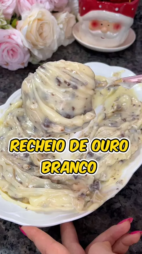 Recheio de ouro branco para sobremesas 🍫✨ 1 leite condensado 2 cremes de leite 100g de chocolate branco 5 bombons ouro branco picados ✅🥰 Gostou do vídeo? Então já aproveita e me segue pra não perder nenhuma receita maravilhosa! ✅