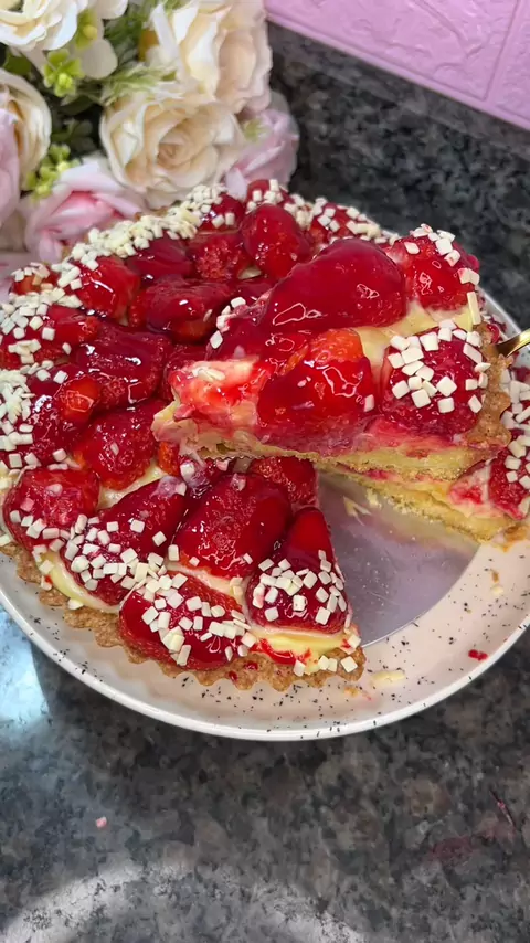 7 dias 7 sobremesas para o natal 🎄🍰🍓 Ep.1 - Torta de morango 🍓 Massa: 2 ovos, 1 xícara de açúcar, 2 colheres de margarina, 2 xícaras de farinha de trigo, 2 colheres cheias de maizena. A forma usada tem 20cm, moldei a massa e deixei no congelador por 40 minutos antes de assar. ( asse por 50 minutos a 200 graus ou até a massa ficar dourada ). 🍓 Recheio: 1 leite condensado, 1 creme de leite, 2 gemas, 1 colher de maizena e 250ml de leite 🍓 Geleia de brilho: 100g de açúcar, 1 colher de mai