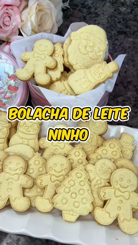 Biscoito de leite ninho para o Natal 🎄🎅🏼 ID dos cortadores na shopee: ASK-ZKN-LHL 1 ovo, 155g de açúcar, 125g de margarina, 125g de farinha de trigo, 50g de leite ninho, 200g de amido de milho ✨ Assaram a 180 graus por aproximadamente 25 minutos ou até eles dourarem por baixo 🤎 Gostou da receita? Então já aproveita e me segue! 🍫