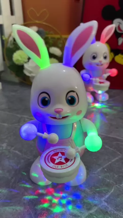 Não é de admirar que o bebê fique tão feliz assim que o vê. Este coelho de tambor é tão fofo.
