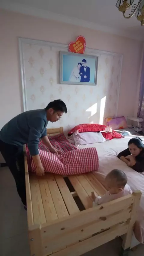Nossa família tem cerca de um ano de idade, o segundo filho, e a cama de emenda feita pelo meu pai foi colocada em uso. você pode dormir sozinho # cama de emenda de madeira maciça # cama de emenda infantil # cama de emenda de pessoa grande # loja de fábrica de cama de emenda de Zhengding