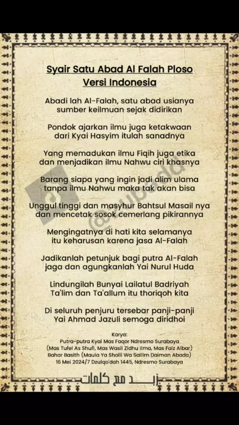 Syair Satu Abad Al Falah Ploso Versi Indonesia Lirik Full #syairsatuabadalfalah #syair1abadalfalah #alfalahploso #santriploso
