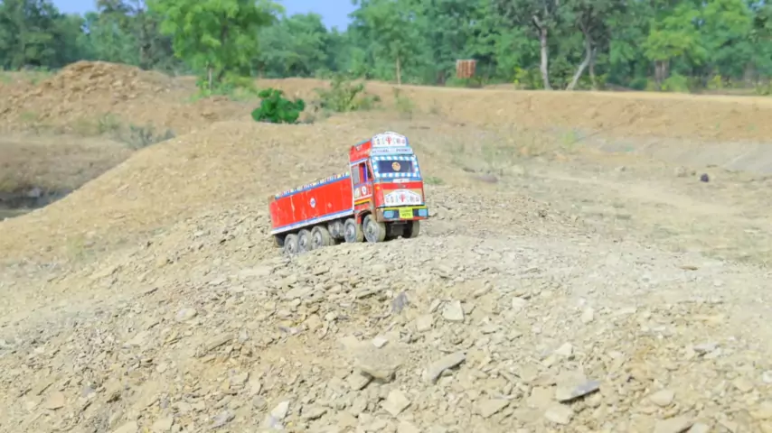 Anak kecil itu menyukai permainan mobil konstruksi, ekskavator dan truk besar yang diangkut di atas lumpur.