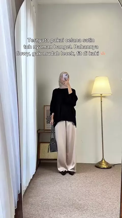 Kalian harus cobain celana satin minimal 1. Dipakainya mewah kaya rok satin, tapi bisa bergerak bebas 🫶🏻