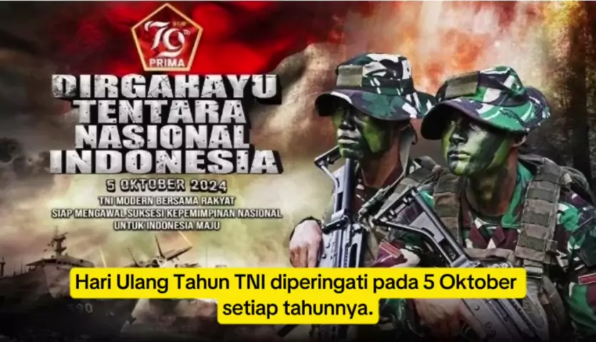 HUT TNI diperingati pada 5 Oktober setiap tahunnya. Tahun ini merupakan peringatan HUT ke-79 TNI. Puncak perayaan HUT ke-79 TNI akan berlangsung pada 5 Oktober dan bertempat di Silang Monas.  Tanggal 5 Oktober, upacara, demo dan devilenya dan konser Band dan Artis artis kesayangan anda.ayoo ajak teman,saudara dan sahabat#huttni#tni#tniad#tnial#tniau#kopassus#konser#ulangtahun#monas#kostrad#kodam#kopassus#denjaka#kopasgat#koopsus#marinir#bravotni#tentara#indonesia#jakarta#jawabarat#jawatengah#ja...
