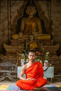 Novicios meditación monje en frente de la estatua de buda. | Foto Premium